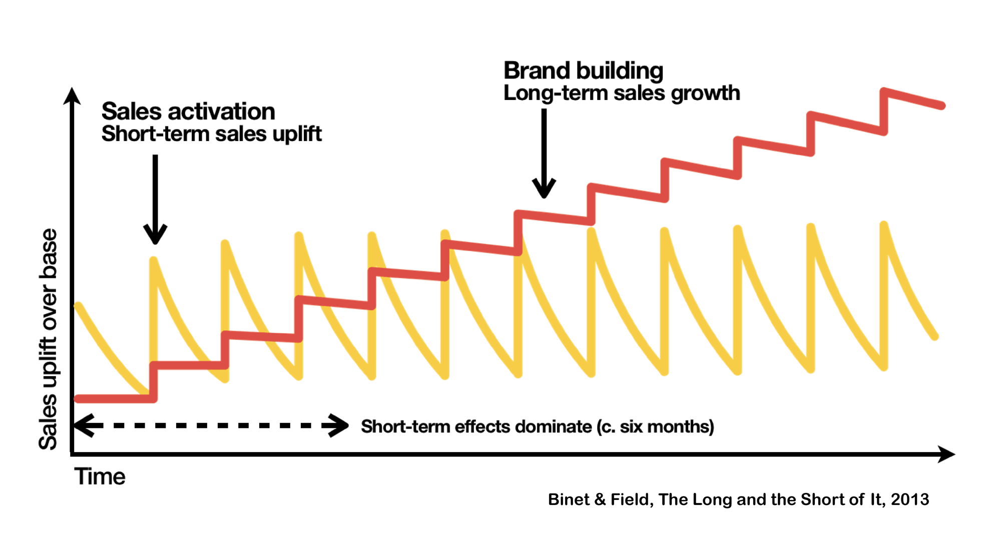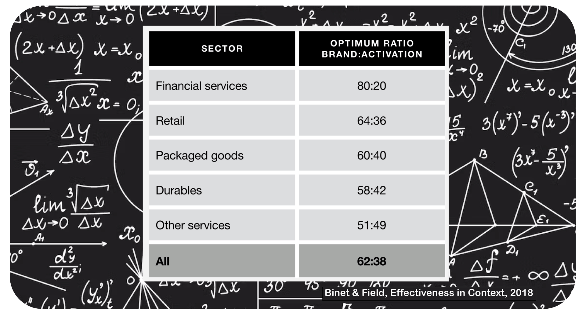 Mieux encore, Binet & Field nous partagent leur formule magique: pour la faire courte 60% de brand building pour 40% de brand activation. Ça permet d’éviter de placer beaucoup d’efforts à vendre du « bof » ou de ne pas assez en mettre pour du « wadafak-madafakas ».