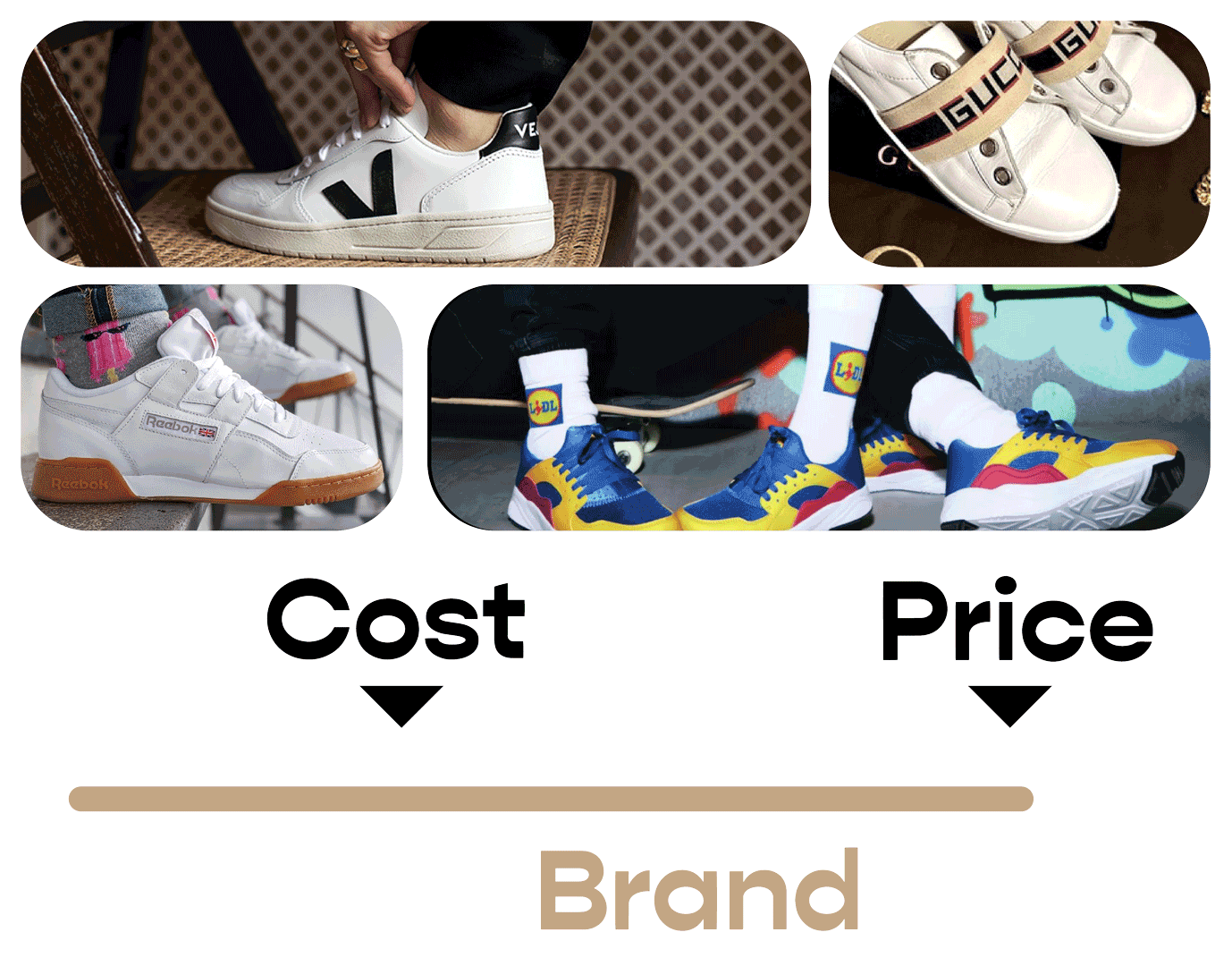 Revenons aux bases: en définitive si Titouan opte pour la sneaker A plutôt que la sneaker B, son choix tient davantage à l’aura de la marque qui rejaillira sur lui, selon que le logo floqué sur le cuir soit Reebok, Gucci, VEJA ou même Lidl.