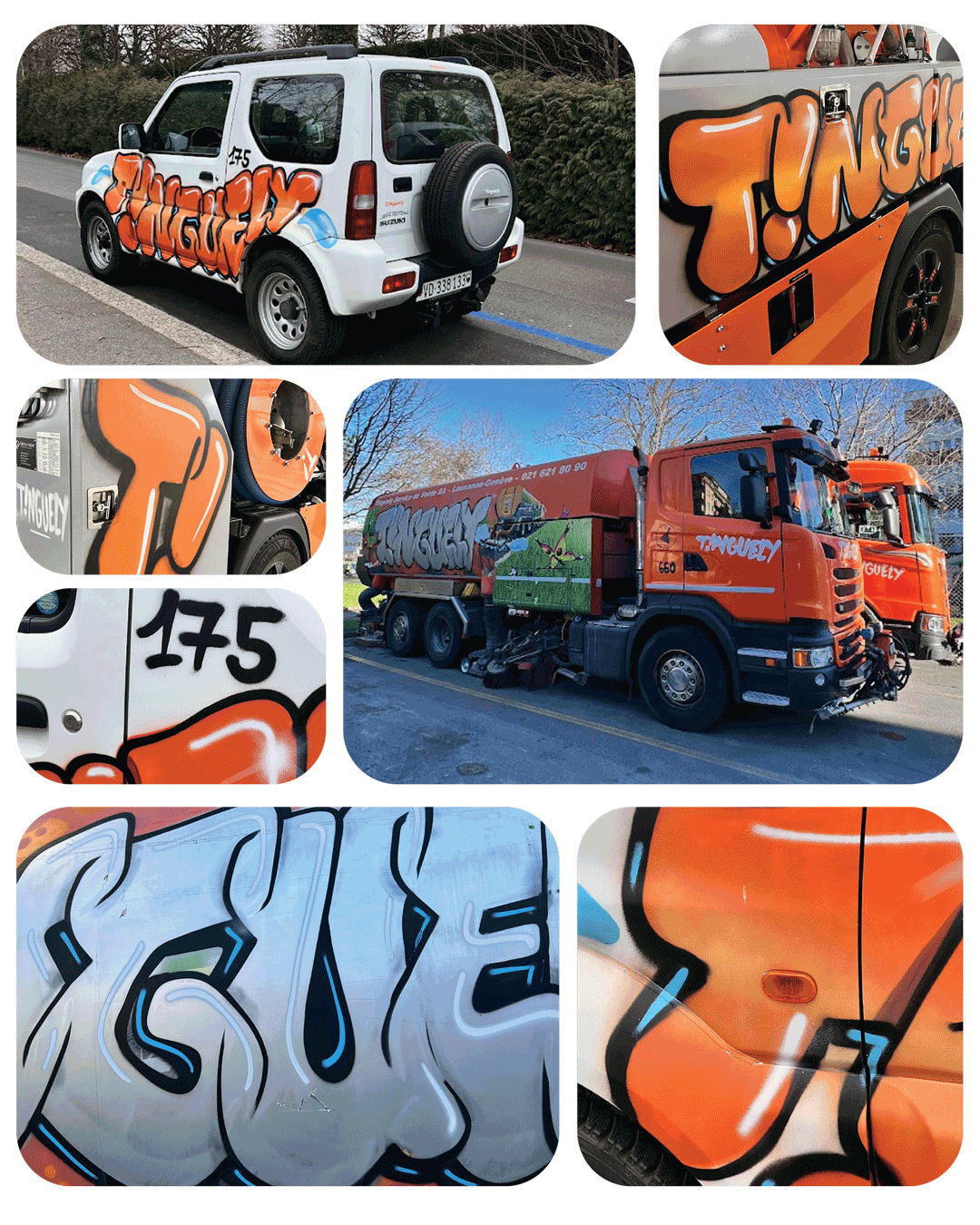 À Lausanne, tout le monde connaît les camions oranges Tinguely, aka les héros des voiries. Fait marquant, depuis 2021 leurs bolides ont troqué les imprimés vectorisés propre à 99,999% des enseignes pour des motifs aérographés grave underground. Même le logo y est passé (quand il a appris ça, Illustrator était en PLS).