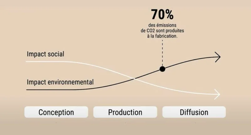 Comme l’explique l’inspirant Mathias Rabiot (Graphéine), le point culminant de l’impact social se situe davantage au niveau de la conception, là où la production et la diffusion voient l’impact environnemental atteindre ses sommets. Des courbes assez logiques qui nous éclairent sur les moments où les différentes composantes de la durabilité entrent en action:
